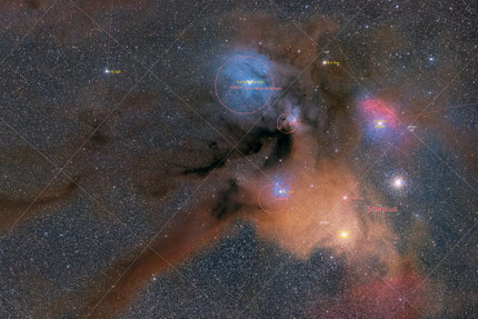 Wasserstoff-Emissionsnebel, blau und gelb schimmernde Reflexionsnebel und staubige Dunkelwolken. Das helle Licht des gelb-roten Antares verleiht dabei den Nebel vielfältige Farbschattierungen.