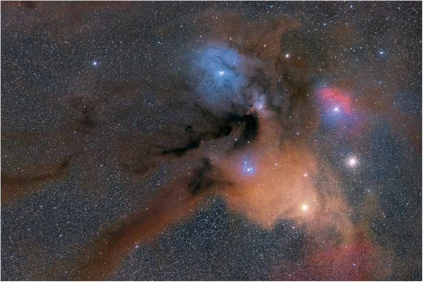 Die Region um Antares, den Hauptstern im Sternbild Skorpion gehört zu den farbenprächtigsten des Himmels. Hier sind fast alle Formen von Gas- und Staubnebel vereint - rot strahlende