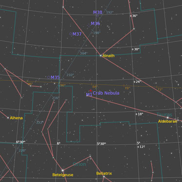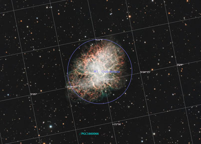 Der Krebs-Nebel im Sternbild Stier sind die Überreste einer Supernova, deren Explosion im Jahr 1054 sowohl chinesischen Astronomen, als auch einem Mönch in Flandern auffiel und von diesen