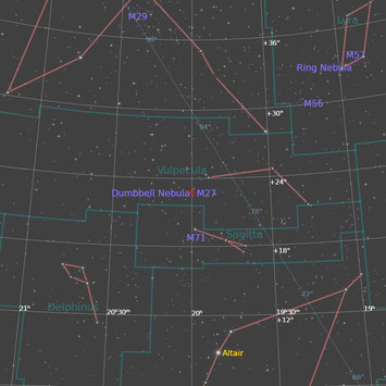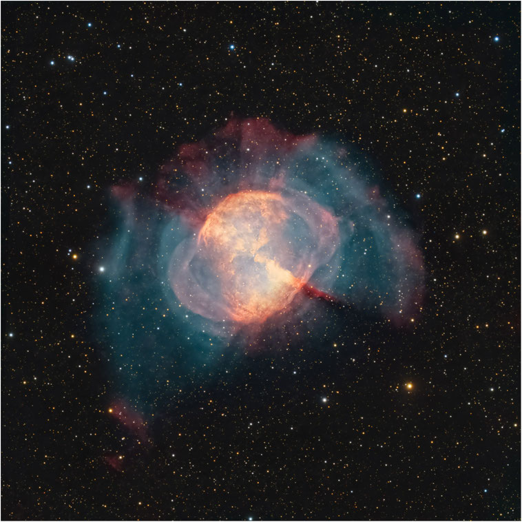 M 27 ist ein 1300 Lichtjahre entfernter planetarischer Nebel im Stenbild Fuchs. Vor ungefähr 10.000 Jahren hat ein roter Riesenstern in seiner Endphase seineHülle abgestoßen, die sich seitdem mit