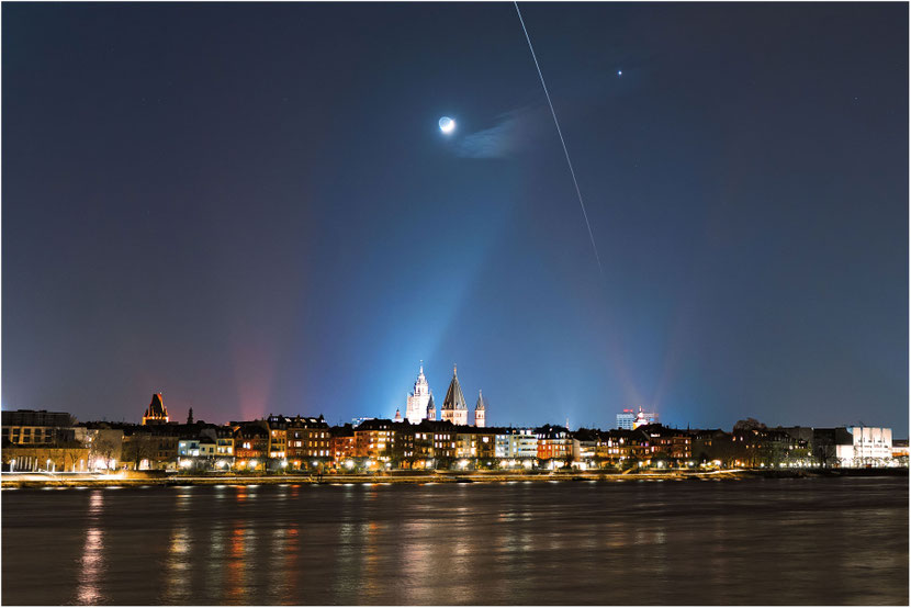 Am Abend des 28.3.2020 flog die Internationale Raumstation (ISS) über Mainz, scheinbar zwischen Mond und Venus hindurch. Genau in diesem Moment gingen in der Stadt wie zur Begrüßung zahlreiche Scheinwerfer zur Gebäudebeläuchtung an. Das Bild veranschaulicht leider auich recht gut das Ausmaß der Lichtverschmutzung.